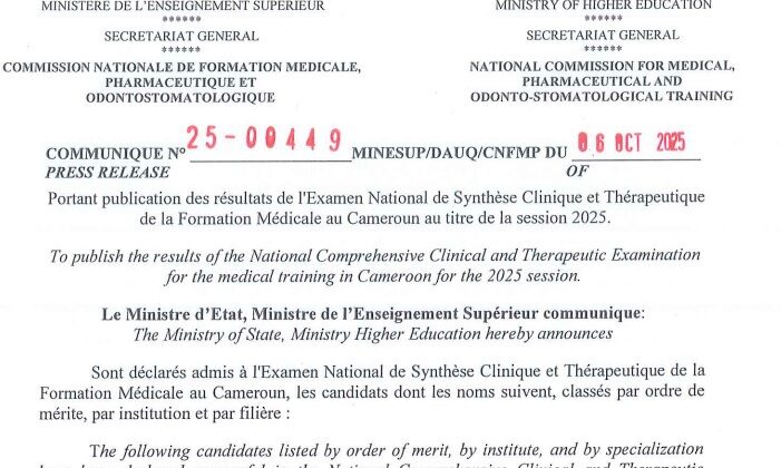 COMMUNIQUE N° 25-0 9449 /MINESUP/DAUQ/CNFMP DU 06 OCT 2025 Portant publication des résultats de l’Examen National de Synthèse Clinique et Thérapeutique de la Formation Médicale au Cameroun au titre de la session 2025