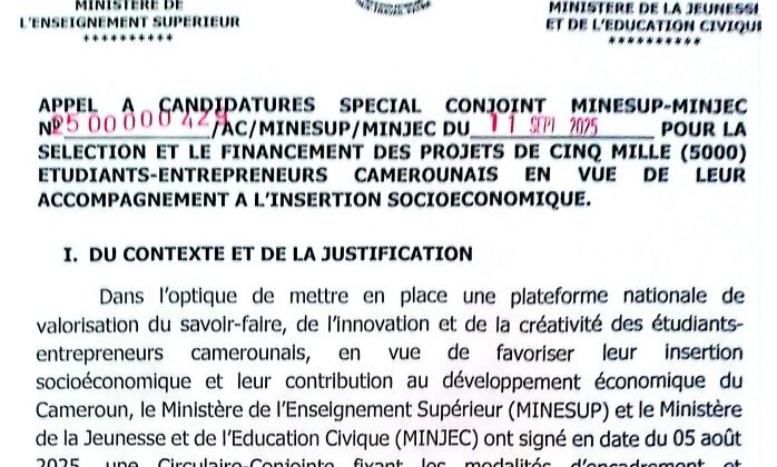 Dans l’optique de mettre en place une plateforme nationale de valorisation du savoir-faire, de l’innovation et de la créativité des étudiants entrepreneurs camerounais, en vue de favoriser leur insertion socioéconomique et leur contribution au développement économique du Cameroun, le Ministère de l’Enseignement Supérieur (MINESUP) et le Ministère de la Jeunesse et de l’Education Civique (MINJEC) ont signé en date du 05 août 2025, une Circulaire-Conjointe fixant les modalités d’encadrement et d’accompagnement des jeunes étudiants inscrits dans les institutions d’enseignement supérieur publiques et privées.