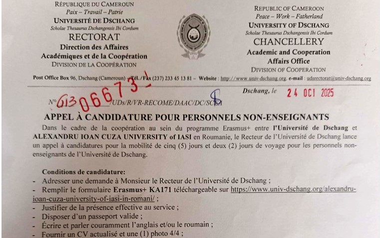 Call for application for teaching staff Within the cooperation framework inside the ERASMUS+ Programme between the University of Dschang