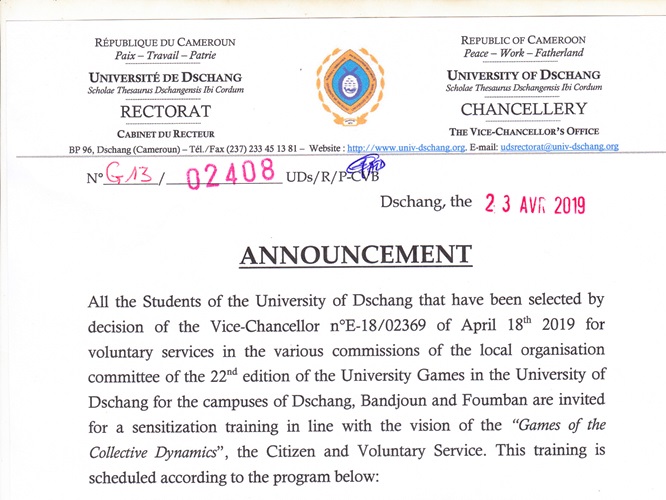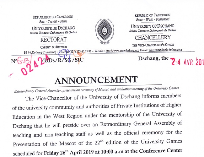 Dschang,UDs/SIC-24/04/19.Le Recteur de L’Université de Dschang porte à la connaissance de la communauté universitaire et de tous les responsables des IPES de