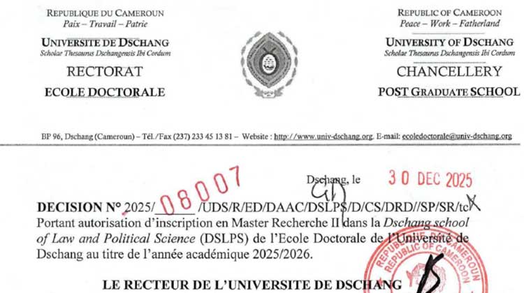 Décision pourtant autorisation d’inscription des étudiants en Master II Recherche à la Dschang School of Law and Political Science (DSLPS), pour l’année académique 2025/2026.