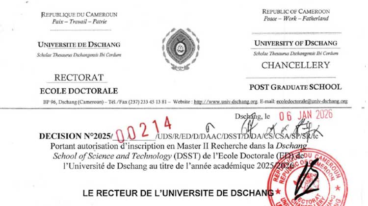 Décision pourtant autorisation d’inscription des étudiants en Master II Recherche à la Dschang School of Science and Technology (DSST), pour l’année académique 2025/2026.