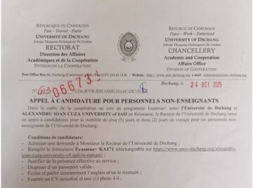 10/22/2025 Erasmus Huelva non-enseignants d No Comments 97 Views Dans le cadre de la coopération au sein du programme Erasmus+ entre l’Université de Dschang et l’Université de Huelva (UHU