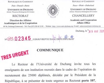 Dschang,UDs/SIC-09/04/21.Le Recteur de L’Université de Dschang invite tous les enseignants de son institution recrutes dans le cadre de l’opération de recrutement des 25000 diplômes, décidée par le Président de la République, a se présenter