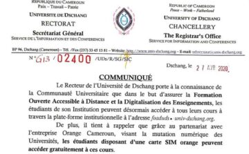 Dschang,UDs/SIC-28/04/20.The Vice-Chancellor of the University of Dschang informs all the lecturers of his institution that in conformity with the academic measures to ensure tele-teaching, the University Campus