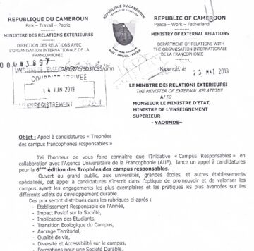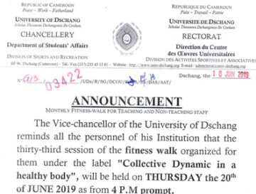 Dschang,UDs/SIC-19/06/19.Le Recteur de l’Université de Dschang rappelle aux personnels de son institution, tous types et couches confondus, que la trente-troisième séance de la marche sportive organisée à leur intention sous le signe