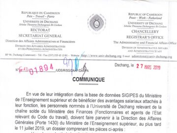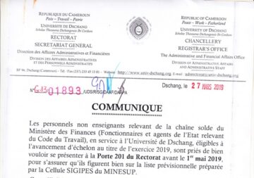 Dschang,UDs/SIC-29/03/19.Les personnels non enseignant relevant de la chaîne solde du Ministère des Finances (Fonctionnaires et agents de L’État relevant du Code du Travail), en service à l’Université de Dschang, éligibles a