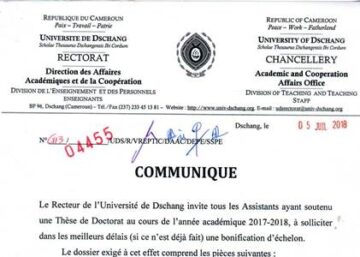 Dschang,UDs/SIC-10/07/18.Le Recteur de l’université de Dschang invite tous les Assistants ayant soutenu une Thèses de Doctorat au cours de l’année académique 2017-2018, à solliciter dans les meilleurs délais (si ce n’est déjà fait)