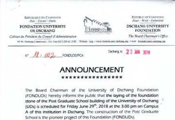 Dschang,UDs/SIC-26/06/18.The Board Chairman of the University of Dschang Foundation (FONDUDs) hereby informs the public that the laying of the foundation stone of the Post