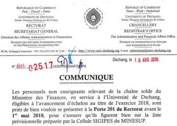 Dschang,UDs/SIC-17/04/18.Les personnels non enseignants relevant de la chaine solde du Ministère des Finances, en service à l’Université de Dschang, éligibles à l’avancement d’échelon au titre de l’exercice 2018,
