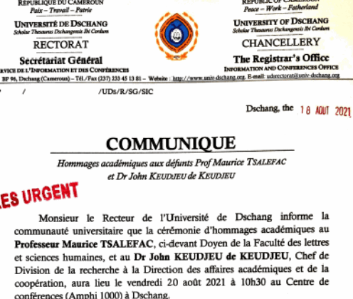 Dschang,UDs/SIC-18/08/21.Le Recteur de l’Université Dschang informe la communauté universitaire que la cérémonie d’hommages académiques au Professeur Maurice TSALEFAC ci devant ,Doyen de la Faculté des Lettres et Sciences Humaine et au Dr John KEUDJEU de KEUDJEU ,Chef de Division de la recherche à la Direction des affaires académique et de la coopération, aura lieu le vendredi 20 Août 2021 à 10h30 au Centre de Conférences à Dschang…