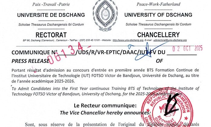 10/07/2025 R. No Comments 51 Views Share on l’Institut Universitaire de Technologie (IUT) FOTSO Victor de Bandjoun, Université de Dschang, au titre de l’année académique 2025-2026. bts_fc_2025