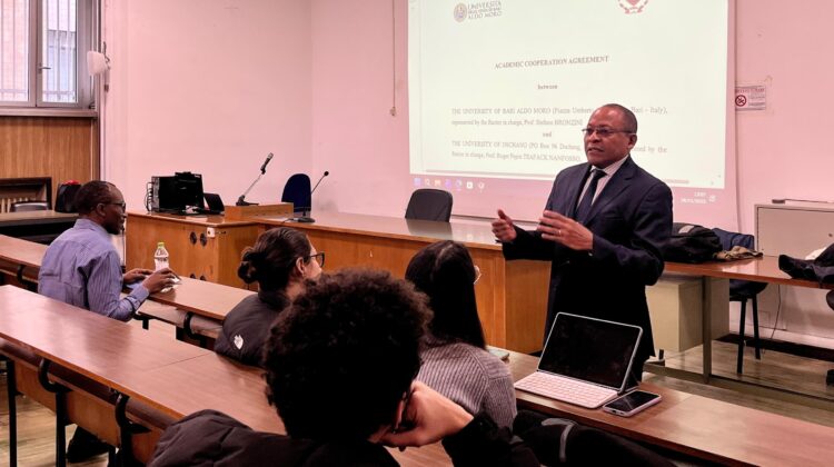 En marge de cette mission, le Professeur Colbert AKIEUDJI a également dispensé une leçon au Département d’Études Italiennes de l’Université de Ferrara (au Centre Nord de l’Italie) à l’invitation du Pr. Matteo Vincenzo D’Afonso, Délégué du Recteur à la mobilité internationale de cette Université. Ce dernier avait visité l’UDs au mois d’octobre 2025, consolidant ainsi l’aura scientifique de l’UDs en Italie. Faut-il le rappeler, Dschang est l’une des rares Universités au Cameroun où il existe un Centre d’études italiennes./
