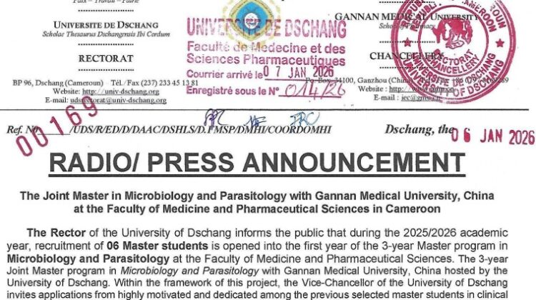 The Rector of the University of Dschang informs the public that during the 2025/2026 academic year, recruitment of 06 Master students is opened into the first year of the 3-year Master program in Microbiology and Parasitology at the Faculty of Medicine and Pharmaceutical Sciences. The 3-year Joint Master program in Microbiology and Parasitology with Gannan Medical University, China hosted by the University of Dschang. Within the framework of this project, the Vice-Chancellor of the University of Dschang invites applications from highly motivated and dedicated among the previous selected master students in clinical biology and public health following the announcement N06989/UDS/R/VR-EPTIC/DAAC/FMSP.